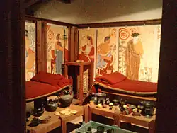 The Etruscans' basic diet[2] consisted mainly of cereal porridge and vegetables. Salt and freshwater fish were certainly part of the diet. Meat consumption was linked to ritual sacrifices and eaten on religious feast days. The hare, depicted on vases in hunting scenes, was a highly prized game animal. Many kitchen utensils, colanders, amphorae, vases, bronze ladles and typical fish plates are on display in European museums, including the Altes Museum, the Louvre and the National Etruscan Museum at Villa Giulia.