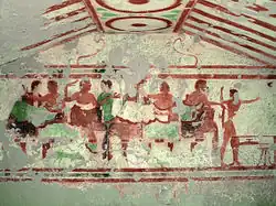 The frescoes found in many Etruscan necropolis depict the Etruscans in the splendor of the Triclinium banquet, drinking and eating with opulence (also evident in the lids of the figurative sarcophagi). The frescoes show the richness of the crockery and everyday objects (such as dice) found in the tombs, accompanying the deceased into the afterlife with the memory of their earthly life.