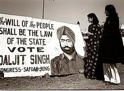 He applied to be in the British Indian Army to win over the soldiers and start a mutiny on command of the Congress' Underground Movement, although was turned down by the British Government.[6] From 1942 to 1945 he sheltered Aruna Asaf Ali, his older brother, a famous journalist, Khushwant Singh had noted that Mrs Asaf Ali came to their house in a Burqa one night and asked for a duplicator- Khushwant Singh had replied that the fight against Fascism was more important than the British at the time, but he mentioned the incident to Daljit Singh who bought one not realizing the name of the buyer had to be recorded on the duplicator.[7] In a police raid on Aruna Asaf Ali's hideout they traced the duplicator back to Daljit Singh, who was arrested.[7] His father Sobha Singh was expecting a knighthood that year and was aghast; he immediately went to see the Commissioner of Delhi, Sir Evan Jenkins.[7] Sobha Singh did end up receiving a knighthood and Daljit Singh was released after a while.[7]