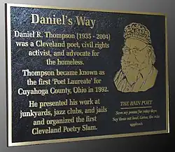Thompson promoted the idea of renaming the University Circle portions of East Blvd. after Hart Crane and Langston Hughes. A street was named for him after his death, Daniel's Way can be found in downtown Cleveland.[4] Cleveland poet Chris Franke failed to paint his house after being ordered by the city to do so. Thompson arranged a creative solution where Franke did community service: reading his poems to a soup-line audience at a homeless shelter.[5]