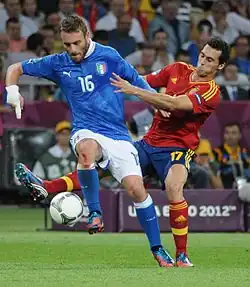 In May 2012, De Rossi was named to Prandelli's final 23-man squad for UEFA Euro 2012.[117] Due to Andrea Barzagli's pre-tournament injury, however, De Rossi played as a central defender in a three-man defence in Prandelli's 3–5–2 formation, alongside Giorgio Chiellini and Leonardo Bonucci, during Italy's opening two group matches of the competition against Spain and Croatia, which both ended in 1–1 draws, receiving praise for his performances in the media; he was temporarily replaced by Thiago Motta and Riccardo Montolivo alongside Pirlo and Marchisio in Italy's three-man midfield.[118][119][120] He then played a more regular midfield-role against the Republic of Ireland in the last group match, partnering with Claudio Marchisio and Andrea Pirlo.[120] He continued to play as a midfielder against England in the quarter-final, in which Italy went through after a penalty shootout victory.[120] De Rossi also played the entire semi-final against Germany, as Italy won the match 2–1,[121] and also played all 90 minutes in Italy's 4–0 defeat to Spain in the final.[122] De Rossi was included in the Team of the Tournament for his performances.[123]