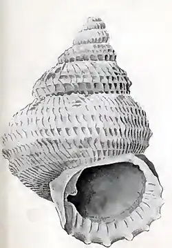 Sculpture : The body whorl carries eleven widely spaced fine spiral cords, the peripheral strongest. Of these six appear on the penultimate and fade gradually away on the upper whorls. Both cords and interspaces are crossed by delicate oblique lamellae which rise into scales upon the cords. They are crowded on the last whorl, do not cross the suture from whorl to whorl, and become fewer and fainter ascending the spire. The initial whorl is smooth. The aperture is very oblique and subcircular. The outer lip is effuse, fimbriated by the termination of the spiral sculpture. The inner lip projects over the umbilical region, thence spread from the axis to the right insertion as a solid sheet. The columella is spirally ascending within, terminating below in a downwardly directed tubercle, succeeded by a deep notch and an answering ridge. Thence along the edge of the gullet underneath the external varix are about a score of callus rays, alternately long and short, leading to the throat. Behind the aperture, about a millimetre from the free edge, is a sharp, narrow varix rising gradually at the base and ending abruptly at the suture.[2]