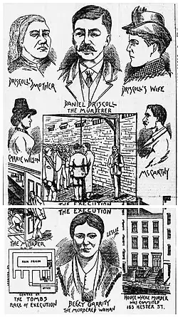 Days before his conviction, Driscoll was moved to "Murderer's Row" after it was discovered by the warden that Driscoll had been attempting to tunnel out of his cell.[4] He was guarded by Inspector Williams and 75 police officers for the remainder of his time in The Tombs. He was allowed to see his relatives the day before his execution and, in his last words to his wife, Driscoll said "I die happy. Take good care of yourself, Mary. I'll pray for you in heaven." Maintaining his innocence, he continued to make criminal charges against Warden Walsh. These charges were disputed among a number of prison guards who signed a petition in his defense.[7]