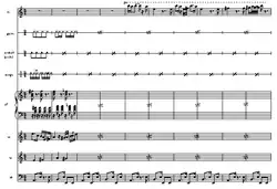 Generally speaking, the danzón-mambo represents a further and stronger incorporation of elements of the son into the danzón. The first sections, or danzones, did not depart significantly from the traditional danzón structure [1]. But, the final section of the danzón-mambo was based on tumbaos and guajeos from the montuno section of the son, which created a complex, clave-oriented polyphony with strong accents on the upbeat (Santos 1982). In order to further reinforce the son feeling, Arcaño added the tumbadora (conga drum) to the traditional charanga percussion lineup of pailas and güiro. Also, the paila player began to use a cowbell in the final section (Santos 1982). This final section, at first called nuevo ritmo, later came to be called mambo.[1]