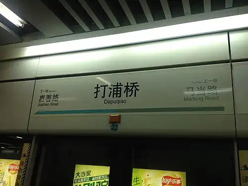 Dapuqiao (simplified Chinese: 打浦桥; traditional Chinese: 打浦橋; pinyin: Dápǔqiáo) is a station on Line 9 of the Shanghai Metro. The station came into operation on December 31, 2009. It is located beneath the Xuhui Sun Moon Light Center.