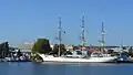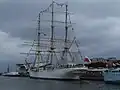 During the following years, rebuilt and converted into training unit fitted i/a with an auxiliary Diesel engine, she was used as a training ship, receiving the nickname "White Frigate". In 1934-1935 she travelled around the world (via Panama Canal). During that famous voyage, she called at many ports as the first ship ever under Polish flag. In 1937 a special voyage took her around the famous Cape Horn; thus she became the first ship under Polish Colours to round the famous cape. In 1938 she took part at the famous meeting of Baltic sail training ships at Stockholm, regarded as the predecessor of all the post-war Operation Sail meetings, winning i. a. special respect the skipper of Norwegian sail training vessel Christian Radich. During World War II she was interned in Stockholm. After the war, she was brought to Communist Poland and used as a training ship again.