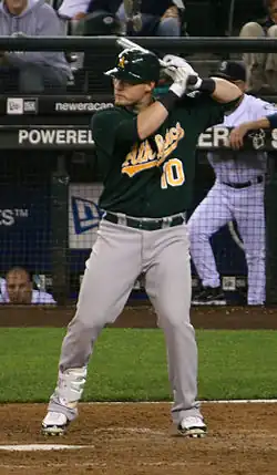Barton began the 2010 season as the A's starting first baseman. On April 25, he fractured his finger while tumbling into the Cleveland Indians dugout.[6] He won a Fielding Bible Award for his statistically based defensive excellence during the year [7] and led his team in runs (79), hits (152), and doubles (33) and accumulated an All-Star caliber 5.5 WAR.[8] He also led the AL in walks with 110, and was second in MLB only to Prince Fielder.[9]