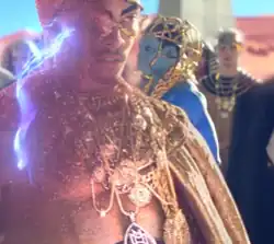 The video was criticized for including a scene where Perry's character disintegrated a man (pictured), originally seen wearing a pendant appearing to display the Arabic word for "Allah", which was subsequently edited out of the video