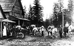 Darrington's residents lobbied the Seattle and International Railway for the construction of a branch line from Arlington to the town as early as 1895,[21] offering a 15-year contract to ship 75 percent of the area's extracted ores. The railroad agreed to the offer and began construction in 1900. It later merged with the Northern Pacific Railway, outpacing Great Northern and their plans to build a railroad to their timber holdings in the Sauk River valley.[22] Railway crews arrived in the Darrington area by the following year and the first train arrived at the town's depot in 1901.[23]
