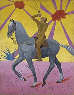 At the start of the First World War Japp joined the British Army, and eventually became a Major in the Royal Field Artillery commanding an artillery battery in Macedonia, for which he was awarded the Military Cross.[1] Coincidentally, Spencer also served in Macedonia in the last years of the war and the British War Memorial Committee was keen for both men to be released from their military duties to work on paintings for the proposed, but never built, national Hall of Remembrance. The Army refused to release either of them until after the Armistice, when Japp, following a visit to the Western Front, began work on the painting The Royal Field Artillery in Macedonia, Spring 1918 (1919), which is now part of the collection of the Imperial War Museum.[3]
