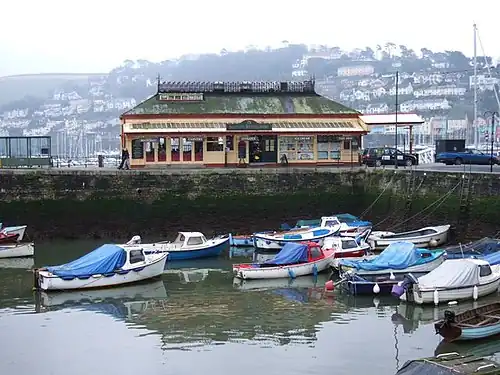 Dartmouth railway station was a booking office for train tickets located on the quayside of Dartmouth in the English county of Devon. While there has never been a railway line at the site, it was possible to book through tickets to and from Dartmouth via the office, accessing trains by travelling on Dartmouth Passenger Ferry to or from Kingswear railway station on the opposite bank of the River Dart.[1] Accordingly, the office was classed as a "railway station" for ticketing purposes if purchasing an integrated ticket combining rail and ferry travel.