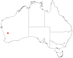 Darwinia masonii has a restricted distribution, endemic to a small area in the Mt Gibson Ranges in the Wheatbelt region of Western Australia. This species is found generally on upper hillsides and ridges above 330 m (1,100 ft) on shallow clay soils over laterite, ironstone, granite or near creeks.[2][3][4]