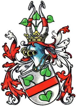 The family coat of arms shows a red bar in silver in front of three green linden leaves placed in a cross of thieves. On the helmet with red and silver covers a growing three-leaf linden branch between two silver buffalo horns, each with a red bar.