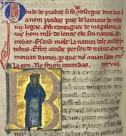 Daude, Deude, Daurde, or Daudé de Pradas (fl. 1214–1282)[1][2] was a troubadour from Prades-Salars in the Rouergue not far from Rodez. He lived to an old age and left behind seventeen to nineteen cansos, including twelve on courtly love, three about sexual conquest, one tenso, one planh (on the death of Uc Brunenc), and a religious song.[1] Only one melody of his entire oeuvre has survived.[1]