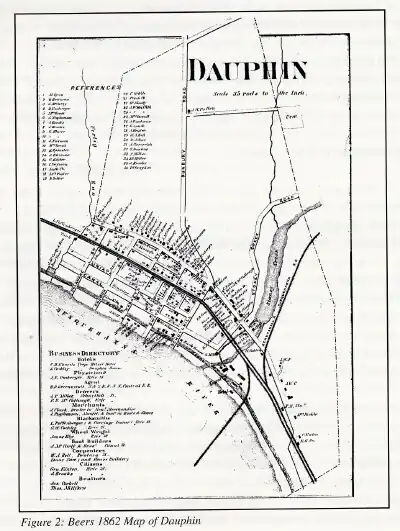 Dauphin was incorporated into a borough by an act of Assembly in 1845.[17] According to the 1850 census, Dauphin had 650 inhabitants at that time. There were 124 families in 118 dwellings. The 1860 census for the borough illustrated the working-class nature of the people living there. The borough had 649 inhabitants in 129 households, nearly the same as recorded in 1850. Fifty-five of the men listed their occupation as "day laborer". The 1870 census showed a marked change in the occupation of Dauphin's residents. Jobs related to the canal had dropped dramatically, while those associated with the railroads had increased substantially. At this time there were 151 households living in 148 dwellings. The borough's population had increased to 742. By 1875, the borough contained four churches, three schools and one select school, and two lodges. The 1880 census showed 155 families living in 146 dwellings in Dauphin.