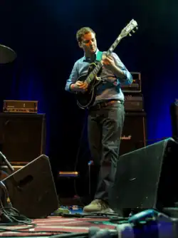 ![]() Dave Konopka of Battles performing at the 2008 Bonnaroo Music Festival in Manchester, Tennessee | |