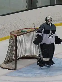 On February 22, 2020, both of the Carolina Hurricanes' goaltenders, James Reimer and Petr Mrázek, were injured during a game against the Maple Leafs. Ayres entered the game during the second period as the emergency backup goaltender, after signing a one-game contract with the NHL.[6] Donning Kasimir Kaskisuo's old Toronto Marlies helmet and pads,[7] and wearing a Maple Leafs t-shirt under his equipment,[8] he entered the game at 8:41 left in the 2nd period with a 3–1 lead.[9] He allowed goals on the first two shots that he faced before stopping the next eight shots on goal, along with recording one shot on goal, to help seal a 6–3 win for Carolina.[10] He became the first emergency backup to enter a game in the NHL since Scott Foster in 2018.[2] The Carolina Hurricanes celebrated by spraying water after the game on Ayres. Ayres also became the oldest goaltender (at 42 years, 194 days) to win his NHL regular-season debut, and for this, the Hockey Hall of Fame was given his game-used goalie stick.[11][12] The record had been held by Hugh Lehman since 1927 at 41 years 21 days.