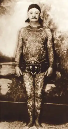 David E. Warford (1866−1942) was an Arizona cowboy. He served as a member of the Rough Riders in Cuba as part of B Company, 1st Volunteer Cavalry Regiment.[1] In June 1898 during the Battle of Las Guasimas, a bullet entered his right thigh, ricocheted through his abdomen and exited out his left thigh. He was evacuated to a hospital ship. In 1901, he was appointed as a United States Forest Ranger. In 1903, he enlisted as a private in the Arizona Rangers. Warford was known for tattoos covering from his neck to ankles. In 1915 he lived at the Pacific Branch of the National Home for Disabled Volunteer Soldiers. He was buried at the Sawtelle Soldiers' Cemetery in Los Angeles, California.