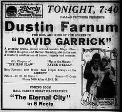 David Garrick is a 1916 American silent historical film directed by Frank Lloyd and starring Dustin Farnum, Winifred Kingston and Herbert Standing.[1] The film was based on Thomas William Robertson's 1864 play of the same name, which portrayed the life of the eighteenth century British actor David Garrick. It was one of several film versions of the play made during the silent era.