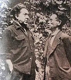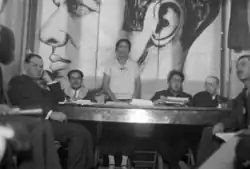 Siqueiros was a member of the Mexican Communist Party. Although he went to Spain to support the Spanish Republic against the forces of Francisco Franco with his art, he volunteered and served in frontline combat as a Lieutenant Colonel in the Army of the Republic through 1938 before returning to Mexico City.[2] In 1940, he led a failed assassination attempt on Leon Trotsky in which Trotsky's 14-year-old grandson was shot and American communist Robert Sheldon Harte was executed.[3][4][5] After spending several months on the run from Mexican authorities disguised as a peasant, Siqueiros was eventually apprehended in Jalisco, although he would never be brought to trial and was freed shortly.[6]