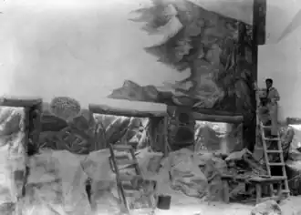 After spending many years in Mexico and being heavily involved in radical political activities, Siqueiros went to Los Angeles, California in 1932 to continue his career as a muralist. Working in a collective unit that experimented with new painting techniques using modern devices such as airbrushes, spray guns and projectors,[17] Siqueiros and his team of collaborators painted two major murals. The first, entitled Street Meeting, was commissioned for the Chouinard School of Art. It depicts a group of workers of mixed ethnicities listening to an angry labor agitator's speech during a break in the workday.[18] The mural was washed over within a year of its unveiling – due to weather-related issues, and perhaps the Communist content of the work. Siqueiros' other significant Los Angeles mural, Tropical America (full name: América Tropical: Oprimida y Destrozada por los Imperialismos, or Tropical America: Oppressed and Destroyed by Imperialism),[19] was commissioned shortly after the unveiling of Street Meeting, and was to be painted on the exterior wall of the Plaza Art Center that faced the busy Olvera Street. Tropical America depicts American imperialism in Latin America, a much more radical theme than was intended for the work. Although it received generally favorable criticism, some viewed it as Communist propaganda, which led to a partial covering in 1934 and a total whitewash in 1938.[20] Eighty years later, the Getty Conservation Institute performed restoration work on the mural.[21] As no color photographs of Tropical America are known to exist, conservators used scientific analysis and best practices to get at the artist's vision of the mural. It became accessible to the public on its 80th anniversary, October 9, 2012.[22] The América Tropical Interpretive Center that opened nearby is dedicated to the life and legacy of David Alfaro Siqueiros.[23][24]