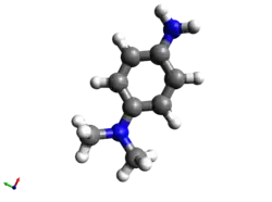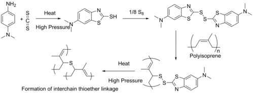 In the early years of rubber production, high quality natural rubber was obtained from the tree, Hevea braziliensis, found in the regions bordering the Amazon river.[5] The high quality rubber exhibited desired properties, such as a high tensile strength (greater than 2800 psi) and a two-hour vulcanization time. Vulcanization is the process by which natural rubber is strengthened by cross-linking the different polymer chains, with either elemental sulfur bridges or other molecules known as accelerators. However, high quality natural rubber was expensive, with a price exceeding $1.50 per pound.[5] Diamond Rubber experimented with various additives, such as mercury iodide and aniline, in an attempt to improve the properties of lower quality rubber. The addition of only 2.5 to 6 percent of these additives improved the tensile strength of low quality rubber from 1800 psi to 2800 psi, and shortened the vulcanization time to a 90 minutes. However, these additives were detrimental to the lifetime of the rubber. In 1912, Spence was working with George Oenslager at Diamond Rubber to discover different additives to overcome these shortcomings. Working off of Oenslager's aniline additives, Spence discovered that p-aminodimethylaniline was a far superior accelerator, requiring only 0.5 weight percent added to the vulcanization process, to vastly improve the tensile strength of the rubber.[5] P-aminodimethylaniline was adopted as the accelerator of choice by the Diamond Rubber Company in 1912.[6]