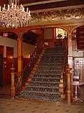 The Tiffany glass windows have been estimated to be worth more than the house itself.[7][8] The window designs often feature themes oriented around the purpose of the rooms they are located in. For example, the music room's windows are themed towards elements of music as well as images of Saint Cecilia, the patron saint of music. The grand staircase features a massive stained glass window portraying a knight, paying homage to the various members of the Whitney family who were knighted, as well as their relationship to the royal blood line in England. The house was the first residence in Detroit to have a functioning elevator for personal use.