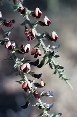 Daviesia arenaria, commonly known as sandhill bitter-pea,[2] is a species of flowering plant in the family Fabaceae and is endemic to south-eastern continental Australia. It is usually a hummock-forming shrub with many short, spiny branchlets and heart-shaped to elliptic phyllodes with a sharp point on the end, and orange-pink, maroon and yellow flowers.