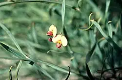 Daviesia implexa is a mound-shaped shrub that typically grows up to 1 m (3 ft 3 in) and 2 m (6 ft 7 in) wide and that has many tangled, glabrous branchlets with ridged or winged branchlets. Its phyllodes are scattered, linear but twisted, 5–100 mm (0.20–3.94 in) long and 2–5 mm (0.079–0.197 in) long. The flowers are arranged in groups of two or three in leaf axils, each flower on a pedicel 2.5–6 mm (0.098–0.236 in) long with bracts 1.5–2.0 mm (0.059–0.079 in) long at the base. The sepals are joined at the base, the upper two lobes joined for most of their length and the lower three pointed. The standard petal is elliptic, 10.0–11.5 mm (0.39–0.45 in) long and yellow or apricot-coloured with a reddish-brown ring around a yellowish-green base, the wings 8.5–11 mm (0.33–0.43 in) long, red and yellow, and the keel is about 6.5 mm (0.26 in) long and yellow. Flowering occurs from September to January and the fruit is a flattened triangular pod 15–17 mm (0.59–0.67 in) long.[2][3]