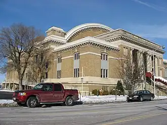 The Memorial Hall is a brick building with a concrete foundation, a ceramic tile roof, and elements of stone and terracotta.[1] Its central section, meant to hold the activities for which the building was constructed, is a two-story structure, while other sections vary in scale: a grand Neoclassical entrance,[2] complete with paired columns in the Ionic order, sits atop a flight of steps in the middle of the facade, while lesser sections flank the entrance and compose the building's sides. Small towers are placed atop the sides, between the central auditorium and the surrounding land. Although the main entrance is only accessed via the flight of steps, side entrance may be gained by the use of a ramp.[3] The building's entrance comprises the memorial itself, housing inscriptions honoring local Civil War soldiers and a sculpture honoring Spanish–American War soldiers; a World War I sculpture sits in the same area.[4]