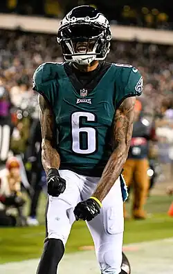 Smith was selected by the Philadelphia Eagles with the tenth overall selection in the 2021 NFL draft, reuniting him with his first college quarterback Jalen Hurts.[47] He was the third wide receiver taken in the draft after Ja'Marr Chase and Jaylen Waddle. Despite his impressive college statistics Smith fell in the draft due to concerns over his raw measurables and that his frame was considered too small to handle playing in the NFL.[48] He signed a four-year rookie contract, worth $20.1 million, on June 3, 2021.[49]