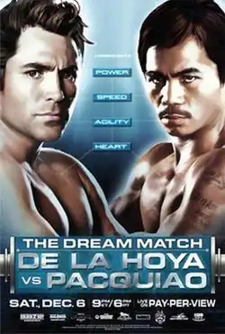 Oscar De La Hoya vs. Manny Pacquiao, also billed as The Dream Match, was a professional boxing match contested on December 6, 2008.[1] Pacquiao defeated De La Hoya via technical knockout when De La Hoya decided not to continue with the fight before the start of the ninth round. The card was a co-production of Bob Arum's Top Rank Boxing and De La Hoya's Golden Boy Promotions and was aired live on pay-per-view (PPV) on HBO PPV. The fight is notable for propelling Manny Pacquiao to full-blown superstar status in much of the western world (mostly in The United States), as Oscar De La Hoya symbolically "passed the torch", so to speak, to Pacquiao. This would mark De La Hoya’s final professional fight when he retired from boxing in 2009.