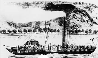 On 18 September at 6 am De Rijn left Mainz for Mannheim, where she arrived at 6 pm. At 6:15 am on the 19th she continued upstream, passing Speyer at 11 am.[11] In the evening of the 19th she arrived at Eggenstein-Leopoldshafen, where she was visited by Grand Duke Louis of Baden.[12] On 21 September De Rijn reached Kehl, proving that steamboats would be used on the Upper Rhine.[13]