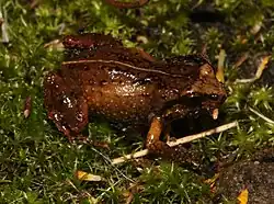 The De Villiers' moss frog (Arthroleptella villiersi) is a minute species of frog in the family Pyxicephalidae, which is endemic to the Western Cape, South Africa.[1] At around 22 mm (0.87 in) length, it is one of the smallest regional species, though larger than the micro frog.[2]
