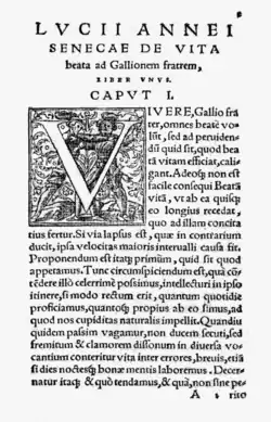 The dialogue has the full title ad Gallionem de Vita Beata ("To Gallio on the happy life"). It was probably written in early 58 or a little earlier.[1] From incidental remarks made in the work, it is thought Seneca wrote it when he was in a position of power near the beginning of Nero's reign between 54 and 59.[2] Furthermore, Tacitus tells us that Publius Suillius Rufus had made a series of public attacks concerning Seneca's wealth in 58, and De Vita Beata contains a defense of wealth which may be a response to this or similar criticisms made around this time.[2]