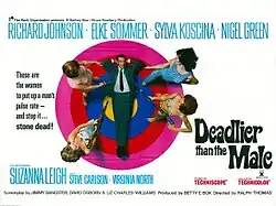 Deadlier Than the Male is a 1967 British crime and mystery film directed by Ralph Thomas and starring Richard Johnson and Elke Sommer.[3] It is one of the many take-offs of James Bond produced during the 1960s, but is based on an already established detective fiction hero, Bulldog Drummond.[4]