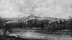 Bucharest at the beginning of the 19th century. Dealul Mitropoliei is in the centre of the drawing; Curtea Arsă to the left and Radu Vodă Monastery to the right (drawing by R. Bielitz)