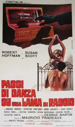 Death Carries a Cane (Italian title: Passi di danza su una lama di rasoio/ Dance Steps on the Edge of a Razor),[2] is a 1973 Italian giallo film directed by Maurizio Pradeaux.[3] It starred Robert Hoffmann, Nieves Navarro and Luciano Rossi.[4] The film was later released on video as The Tormentor, Maniac at Large, The Night of the Rolling Heads and Devil Blade.[2] (Pradeaux went on to direct another giallo, the 1977 Death Steps in the Dark.)[5]