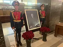 Gorbachev's body lay in state on 3 September within the Pillar Hall of the House of the Unions in Moscow, which has historically been used to hold state funeral services for high-ranking officials and leaders, including for Joseph Stalin after his death in 1953.[4][5] Notably, unlike his successor, Boris Yeltsin, Gorbachev would not be granted a state funeral. However, Kremlin spokesperson Dmitry Peskov did announce that Gorbachev would be given "elements of a state funeral", such as a guard of honor and partial government organization.[6] It was also announced that Russian president Vladimir Putin would not attend Gorbachev's funeral, a move that attracted media attention.[7] A statement from the Kremlin alleged this was due to his busy schedule.[8][9]