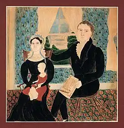Only a handful of works by Goldsmith have been identified, most of them watercolors either on paper or on ivory,[2] although she is known to have produced pictures in oil as well.[6] She produced numerous portraits as well as commonplace books, the latter filled with decorative images, illustrated copies of prints, and a mourning picture in addition to poetry and other writings. She also left behind her worktable and a tin paint box.[5] An 1832 portrait of Permilia Forbes Sweet by Goldsmith is owned by the Fenimore Art Museum,[7] while her portrait of Mr. and Mrs. Lyman Day and their daughter Cornelia, dated c. 1823–1824, is in the collection of the American Folk Art Museum.[8] Her two commonplace books descended in the family, but have been committed to microfilm by the Archives of American Art at the Smithsonian Institution.[6]