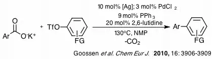 - ^ Goossen LJ, Lange PP, Rodríguez N, Linder C. Low-temperature Ag/Pd-catalyzed decarboxylative cross-coupling of aryl triflates with aromatic carboxylate salts. Chem Eur J, 2010, 16: 3906–09 DOI: 10.1002/chem.200903319