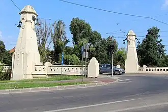 The Decebalus Bridge (Romanian: Podul Decebal) is located in the western Romanian city of Timișoara, spanning the Bega River. It is one of three bridges in the Fabric district, linking it to the inner-city district of Cetate. The eastern end of the bridge is situated between the Neptune Baths and the entrance to Queen Marie Park. It is named after the Dacian king Decebalus.