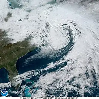 ![]() GOES-16 satellite imagery of the rapidly deepening nor'easter impacting New England at 14:19 UTC (9:19 a.m. EST) on December 5 | |