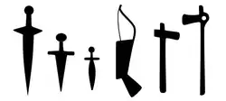 The leaders depicted in these deer Stones (dated to 1400-700 BCE) were equipped with weapons and instruments of war, such as swords, daggers, knives, shafted axes, quivers, fire starters, or curved rein holders for their chariots.[45] Weapons and tools can be seen throughout all the stones, though weapons make a stronger appearance in the Sayan-Altai stones.[2] Bows and daggers appear frequently, as well as typical Bronze-Age implements, such as fire-starters or chariot rein holders.[18] The appearance of these tools helps date the stones to the Bronze Age.