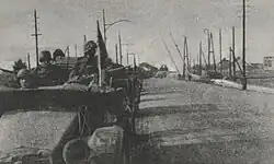 After crossing the tracks of the Radom line, the tanks deployed into combat formation on both sides of the Kraków Avenue.[59] When they were between 400 and 500 meters from the Polish positions, they were fired upon by a Polish anti-tank gun located in the administrative building of Zieleniak, at the first barricade on Grójecka Street. It is likely that infantry from the 6th Company of the 41st Infantry Regiment, defending the barricade, also engaged in the fighting. A battle ensued. The barricade on Grójecka Street, built primarily from wooden, flammable materials, was set ablaze by German shells. Some of the tanks turned west, seeking gaps in the Polish defense. However, they came under fire from the anti-tank gun and machine guns from the positions of the 4th Company of the 40th Infantry Regiment. Perhaps 1 or 2 anti-tank guns from the area of Czyste also opened fire on them. Three tanks turned east and pushed into Mokotów Field but were driven away by a Polish anti-tank gun from the square near the Radium Institute.[60] The following motorized infantry deployed into a skirmish line but was quickly recalled at the signal of a rocket.[61]