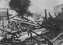On the evening of 8 September, the 4th Panzer Division concentrated in the area of Raków, Zosin, Szczęśliwice, and Rakowiec, where it spent the night in a formation enabling a circular defense.[65] At the same time, artillery was brought up to intensively bombard Warsaw. As a result of the shelling, which lasted into the night, numerous fires broke out in the areas of Sienna, Sosnowa, Śliska, and Złota streets. One of the gas tanks in Wola also caught fire. Consequently, President Starzyński was forced to make the decision to immobilize the Warsaw Gasworks.[66]