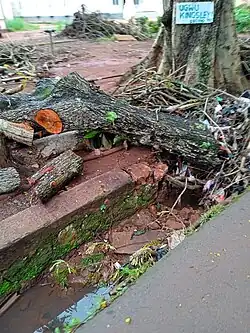 Logging of a healthy ancient tree leading to gutter destruction, pavement destruction and road blockage