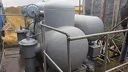A produced water degasser can be either a horizontal or vertical vessel.[5] It operates at a low pressure to maximise the amount of gas (eg methane, carbon dioxide) that is removed from the water stream.[6] It can be located immediately downstream of the production separators prior to low pressure water treatment system such as dissolved gas flotation. In this case the degasser may also act as a surge drum to ensure a steady flow of water to the treatment plant. Alternatively, it can be located downstream of produced water hydrocyclones.[3] In either case the degasser provides sufficient residence time to allow dissolved or entrained gases to be released from the produced water stream. From the degasser water is disposed of via a caisson into the sea, or for disposal elsewhere. The separated gas is routed from the degasser to a flare or vent system for safe disposal. The degasser can be provided with an oil collection device to remove accumulated oil from the surface of the produced water inside the degasser.[5] A degasser may accumulate solids (sand) in its base, facilities to remove solids may be installed.