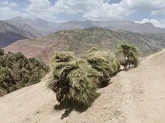 Over hundred years ago grazing has become an ever greater problem with the growth of population and livestock. Dehibolo is located under a 150-200 meters high mountain wall, while on the other side of the ridge the slope is gentle with places suitable for grain fields and pastures, inaccessible because of the wall. A rich widow, Bibi Shah, who owned a large herd of sheep and goats, cattle and horses, and employed many shepherds and servants, proposed to finance a wide trail which would cross the wall. The stonemasons, led by master Olim, built a 500-meter long trail west of the village, in places cut into the cliff and, where necessary, reinforced with wooden rebars.[2] In her honor the path was named "Bibi Shah trail" (Bibishoh shotisi). In 1975 the trail was renovated. It was mentioned in the film "Forgotten Songs" about Boysun, directed by Temurmalik Yunusov.[2][8][9]