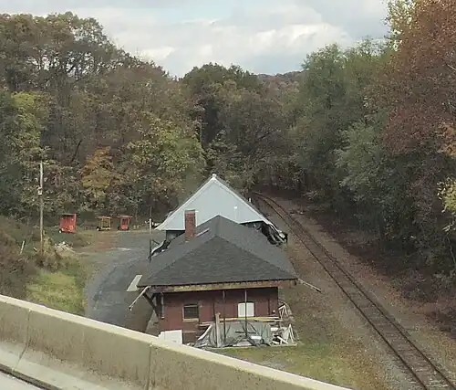 The Delaware, Lackawanna and Western Railroad Water Gap Station is located in Delaware Water Gap, Monroe County, Pennsylvania. Service to Delaware Water Gap along what became known as the Delaware, Lackawanna and Western Railroad started on May 13, 1856.[4] The station structure was designed by architect Frank J. Nies and built in 1903. It consists of two separate one-story brick buildings, a station house and freight house, joined by a common concrete platform and slate covered hipped roof. It is reflective of the Late Victorian style. The station closed to passenger service in March 1953, and was sold to the Borough in 1958.[5] It is said to sit just outside Delaware Water Gap National Recreation Area,[6] though it appears within the area's boundary on maps.